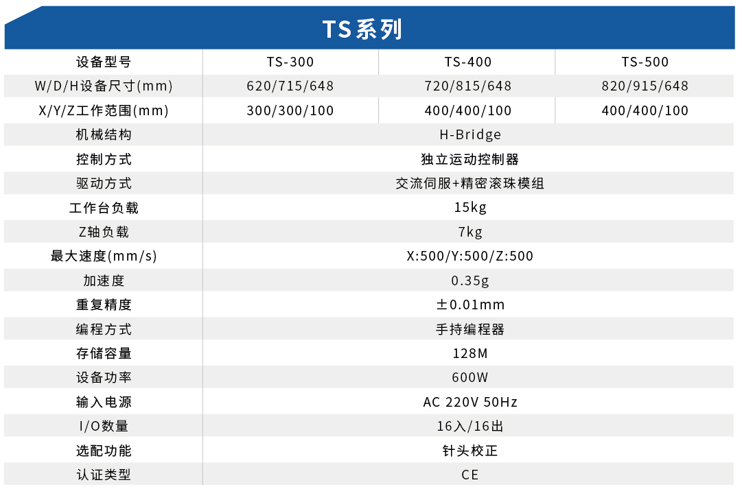 TS系列桌面机器人是由进口伺服电机+精密滚珠丝杠组成的多功能桌面机器人,可搭载不同的阀体,快速实现点胶自动化。半自动化TS系列是一款高性价比的机器人,适用于电子和工业封装,同样也适用于点胶、测试和焊接应用。TS系列机器人包括TS-300、TS-400、TS-500,也可以根据具体需要定制。