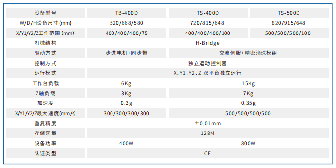 双Y轴桌面机器人效率高、简单实用,编程便利,以性价比实现点胶自动化。双Y轴机器人包括TB-400D、TG-400D、TG-500D、TS-400D、TS-500D,也可以根据具体需要定制。