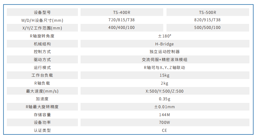 TS-R旋转桌面机器人,可实现±180°旋转,能满足元器件多角度全方位的点胶需求。TS-R系列机器人包括TS-400R、TS-500R,也可以根据具体需要定制。